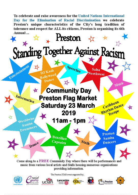 YOU'RE INVITED TO THE 4TH ANNUAL PRESTON STAR EVENTS - Preston STAR events have been organised by the Preston & Western Lancashire REDC together with its key partners; Preston City Council, Lancashire County Council, UCLAN, Preston Youth Council, More Music, Black and Ethnic Minority Forum and Trade Councils. These events are to celebrate and raise awareness for the United Nations International Day for the Elimination of Racial Discrimination and to celebrate Preston's unique characteristics of the City's long tradition of tolerance and respect for all its citizens, and visitors!
